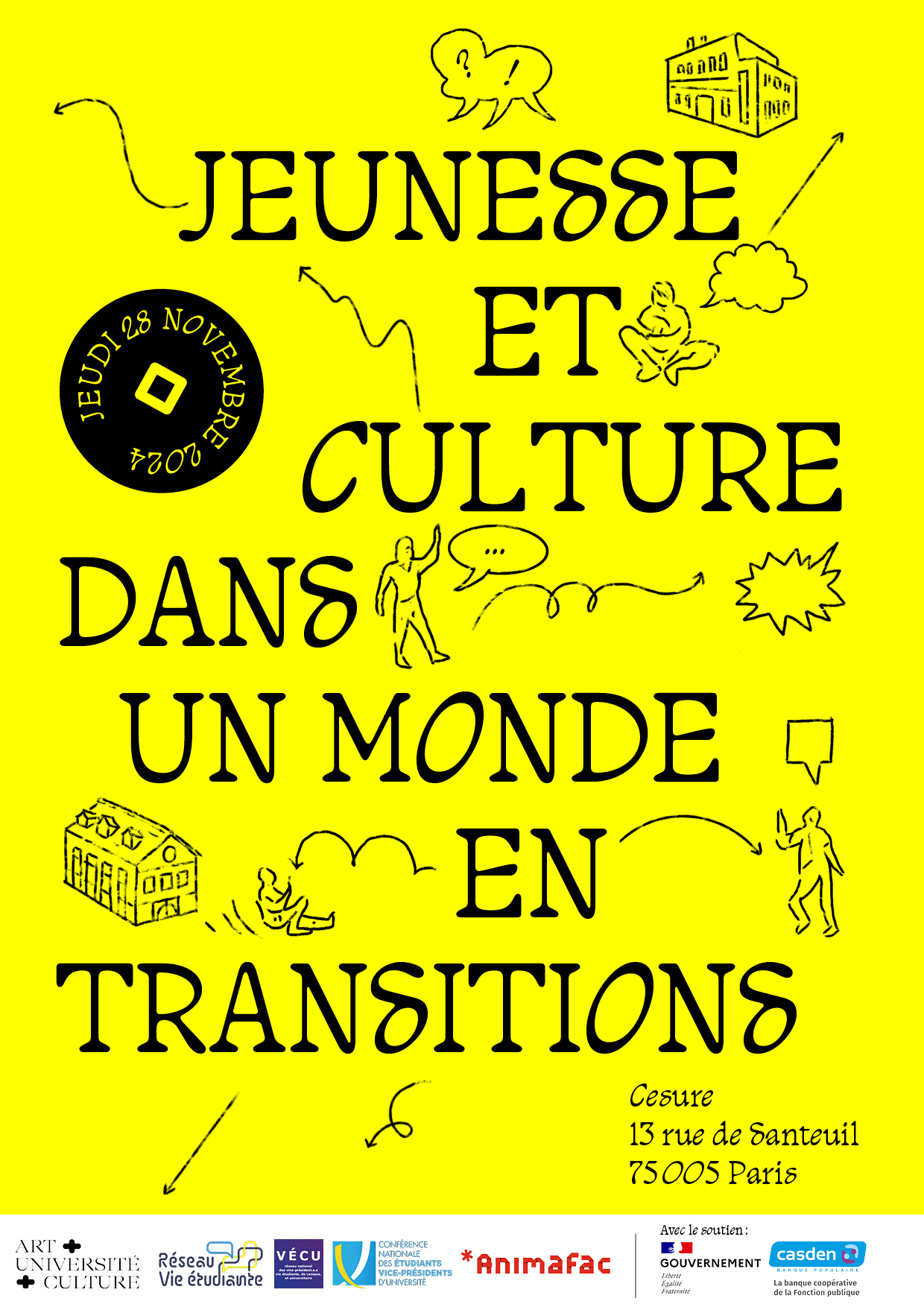 Co-organisée par le réseau national Art + Université + Culture (A+U+C), le Réseau Vie Etudiante (RVE), le Réseau national des vice-président.e.s vie étudiante, de campus et universitaire (Vécu), Animafac et la Conférence nationale des étudiants vice-présidents d’université (CEVPU), cette journée nationale interrogera ce qui fait action culturelle dans un établissement d’enseignement supérieur ainsi que les nouveaux usages et nouvelles pratiques culturelles des étudiant·es.